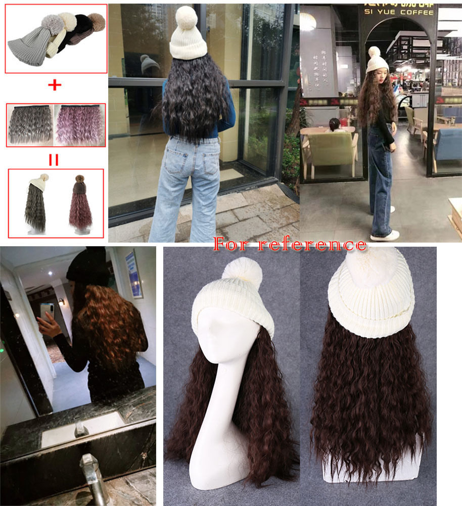Winter Knit Hat with Brown Long Curly Corn Wave